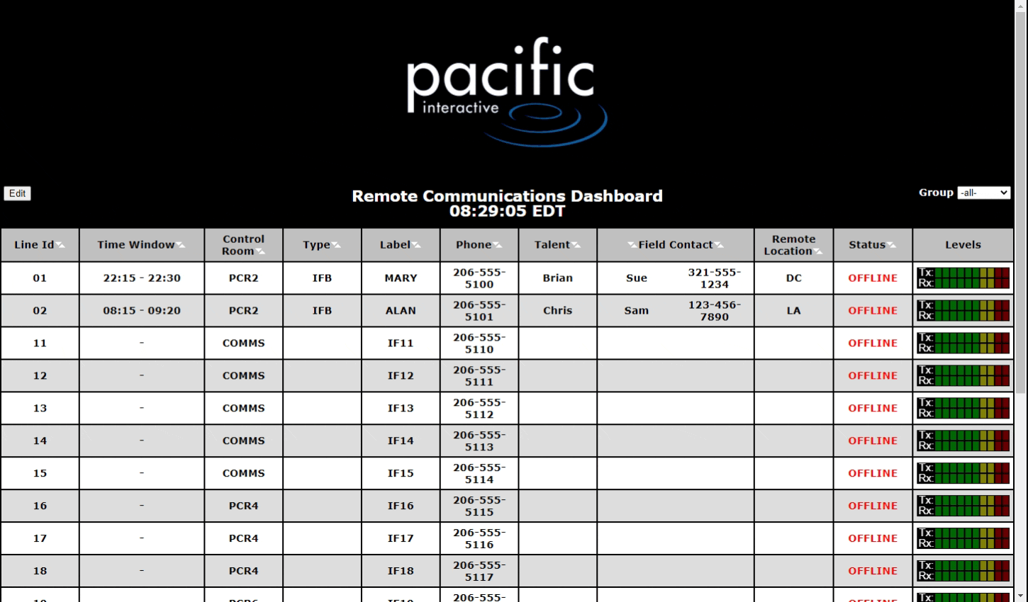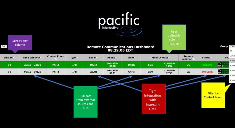 Pacific Interactive’s Remote Communications Dashboard (RCD) provides visual confirmation of intercom system status for broadcast control rooms, network operations centers and operations who depend on intercom communications.